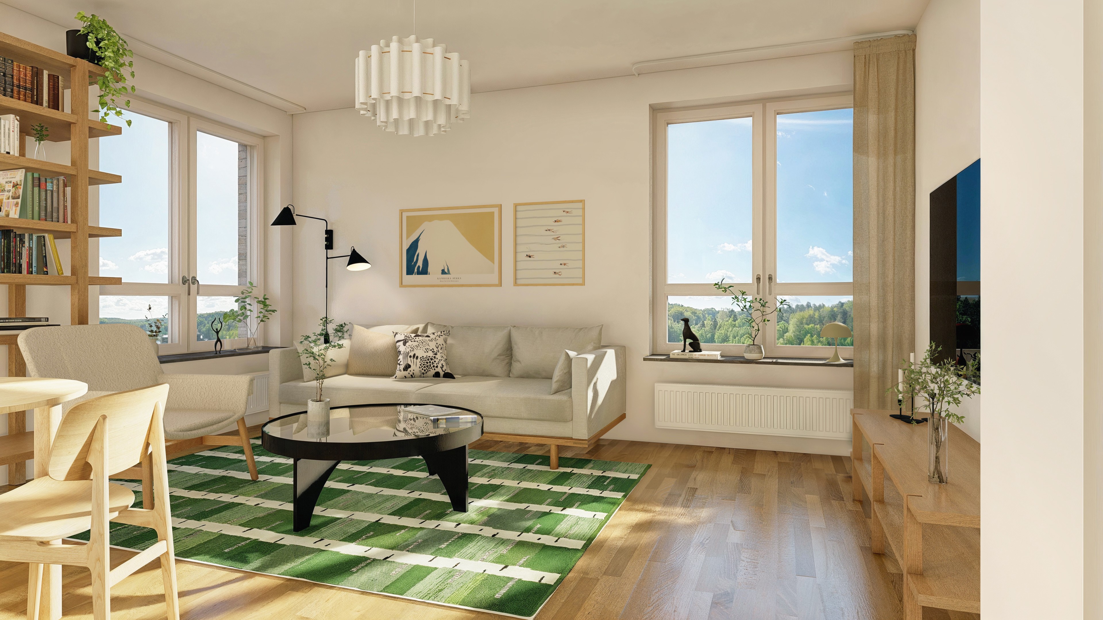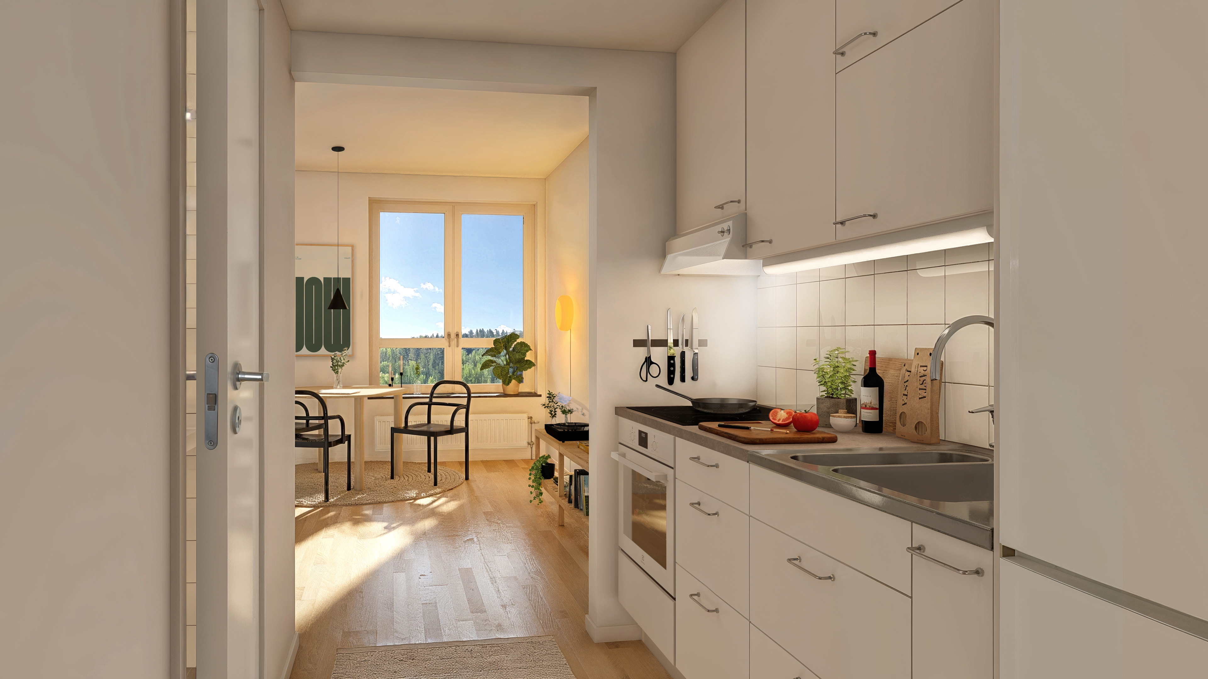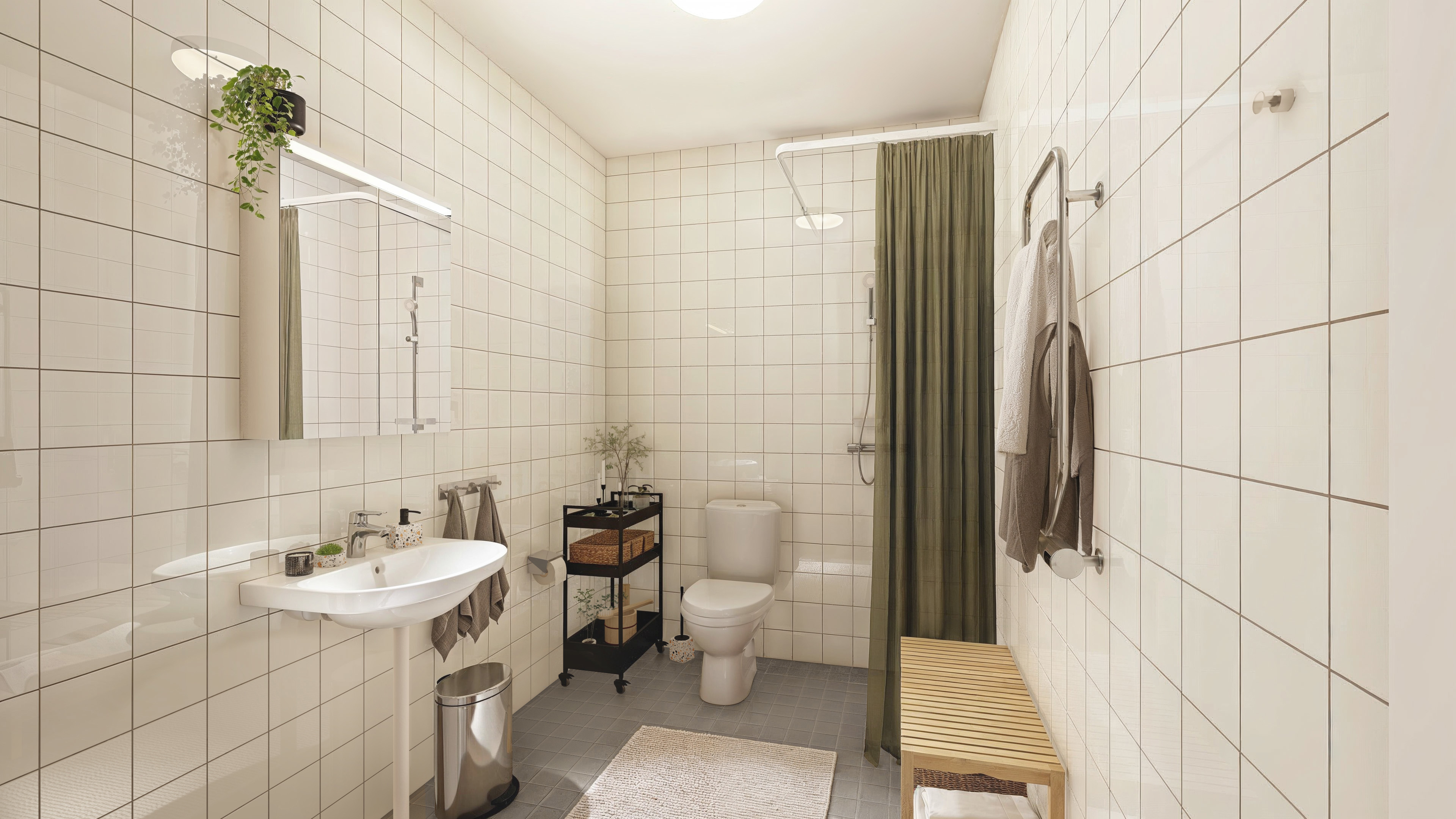 I vardagsrum, sovrum och kök läggs klassisk ekparkett, medan hallen får ett tåligt och lättstädat klinkergolv. Väggarna målas i vitt. Köken från Marbodal utrustas med vita luckor, vitt kakel och en gråmönstrad bänkskiva. Badrummen får kaklade väggar, klinkergolv och dusch.