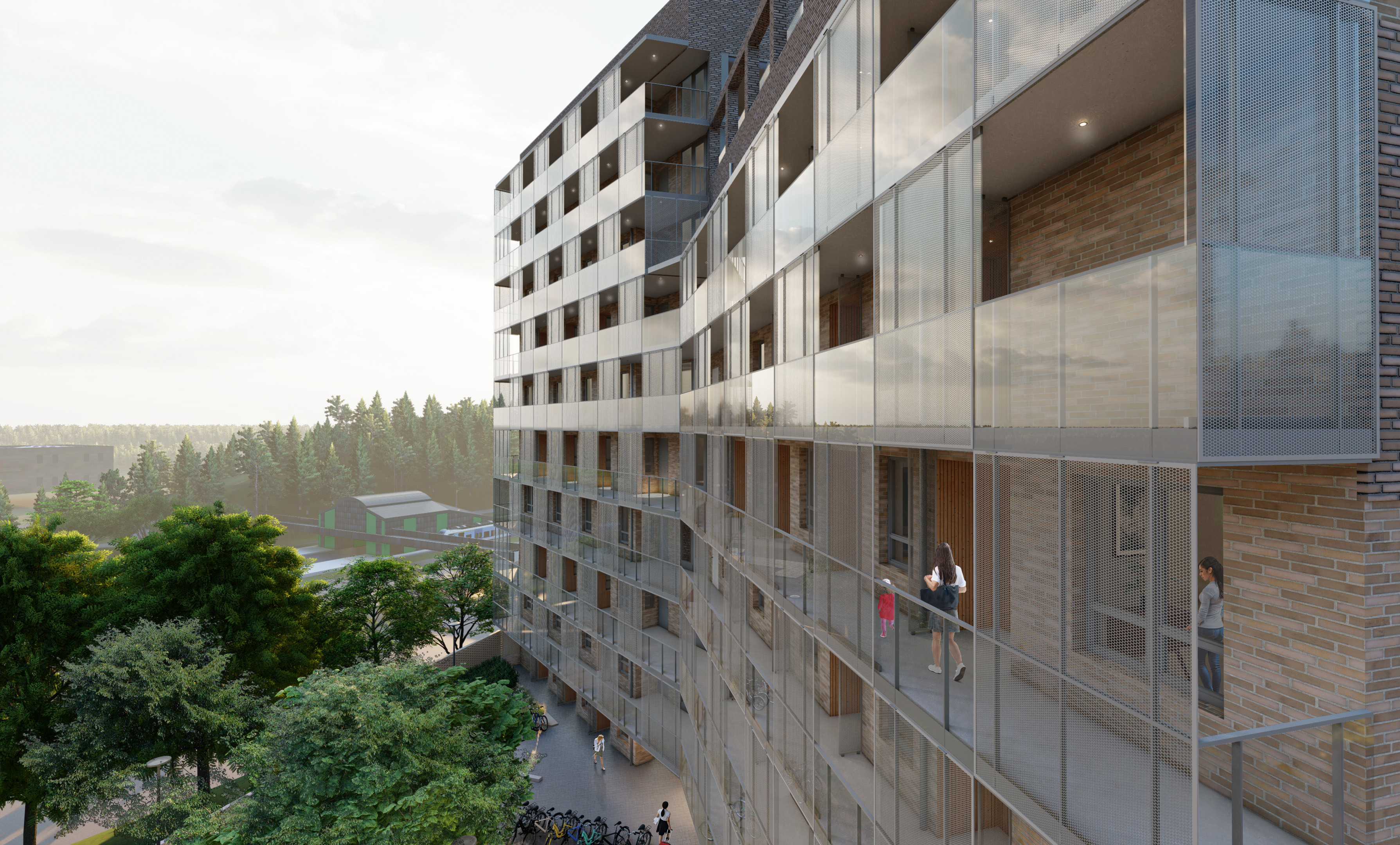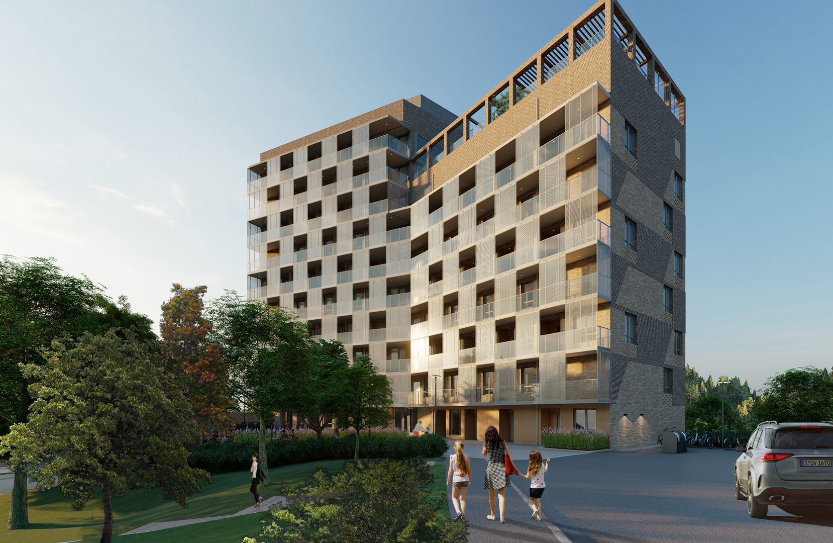 Arkitekturen präglas av en mönstersatt tegelfasad som ger huset ett karaktärsfullt uttryck, kompletterat med träpanel i entréplan. Entrébalkonger utformas med glas och plåtraster som ger ett modernt och lätt uttryck.