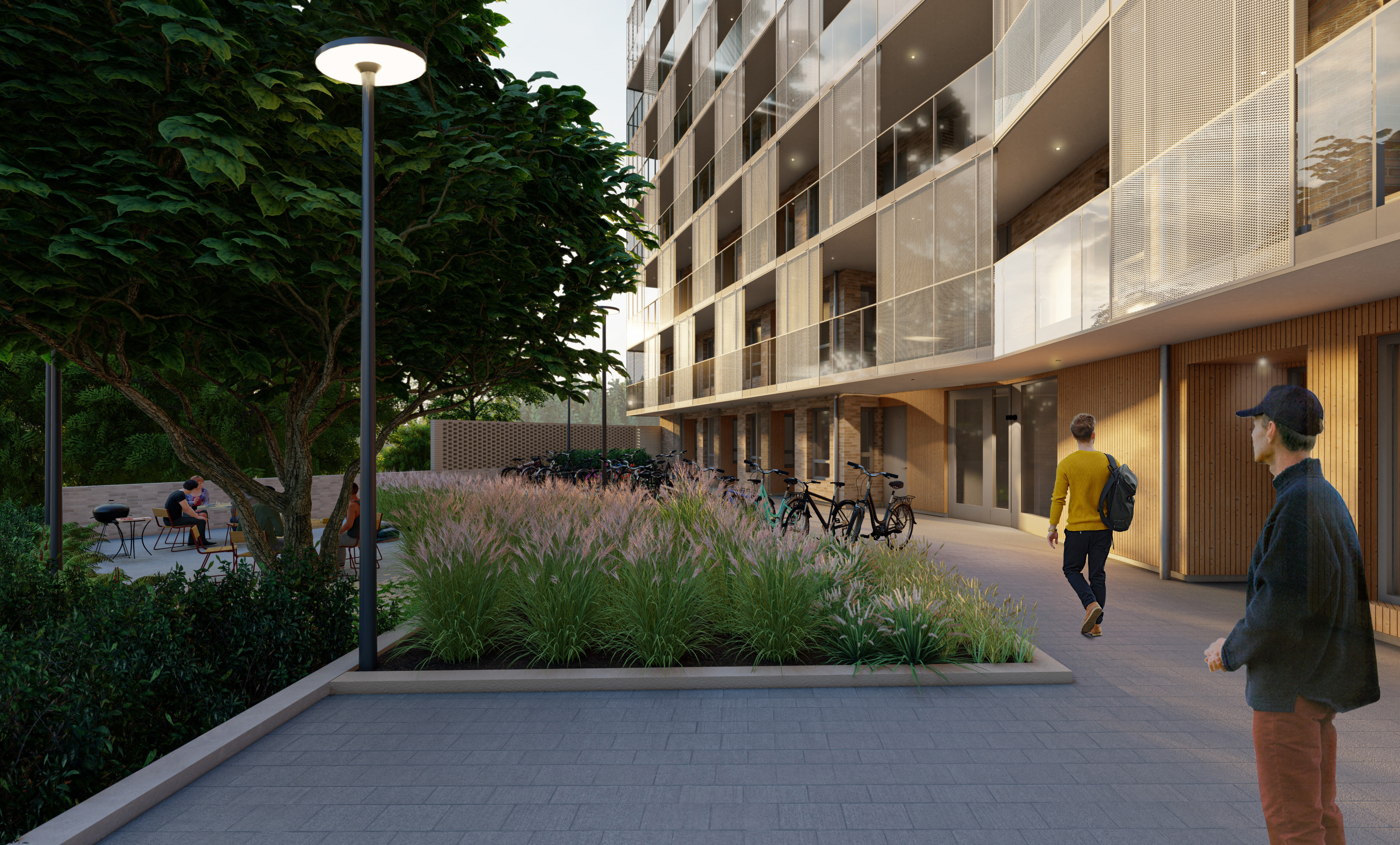 Högst upp på den lägre av huskropparna skapas en gemensam takterrass – en naturlig mötesplats för de boende med utsikt över omgivningarna. I bottenvåningen finns även praktiska gemensamma funktioner som tvättstuga och cykelrum.